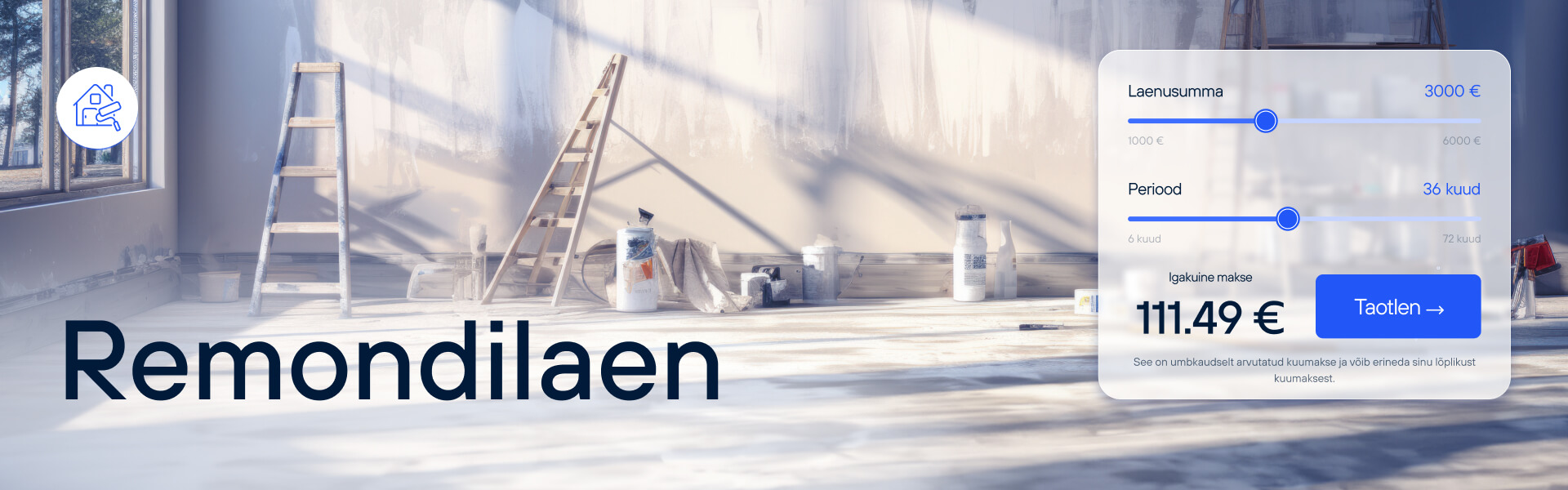 Remondilaen on loodud sinu kinnisvara renoveerimise või parendamise rahastamise eesmärgil. Kata remondi-, sisustus-, uuendus- või laienduskulud. Isegi, kui soovid oma aeda uuendada või vana mööblit välja vahetada, aitab ESTO remondilaen katta kulutused kuni 6000€ ulatuses.